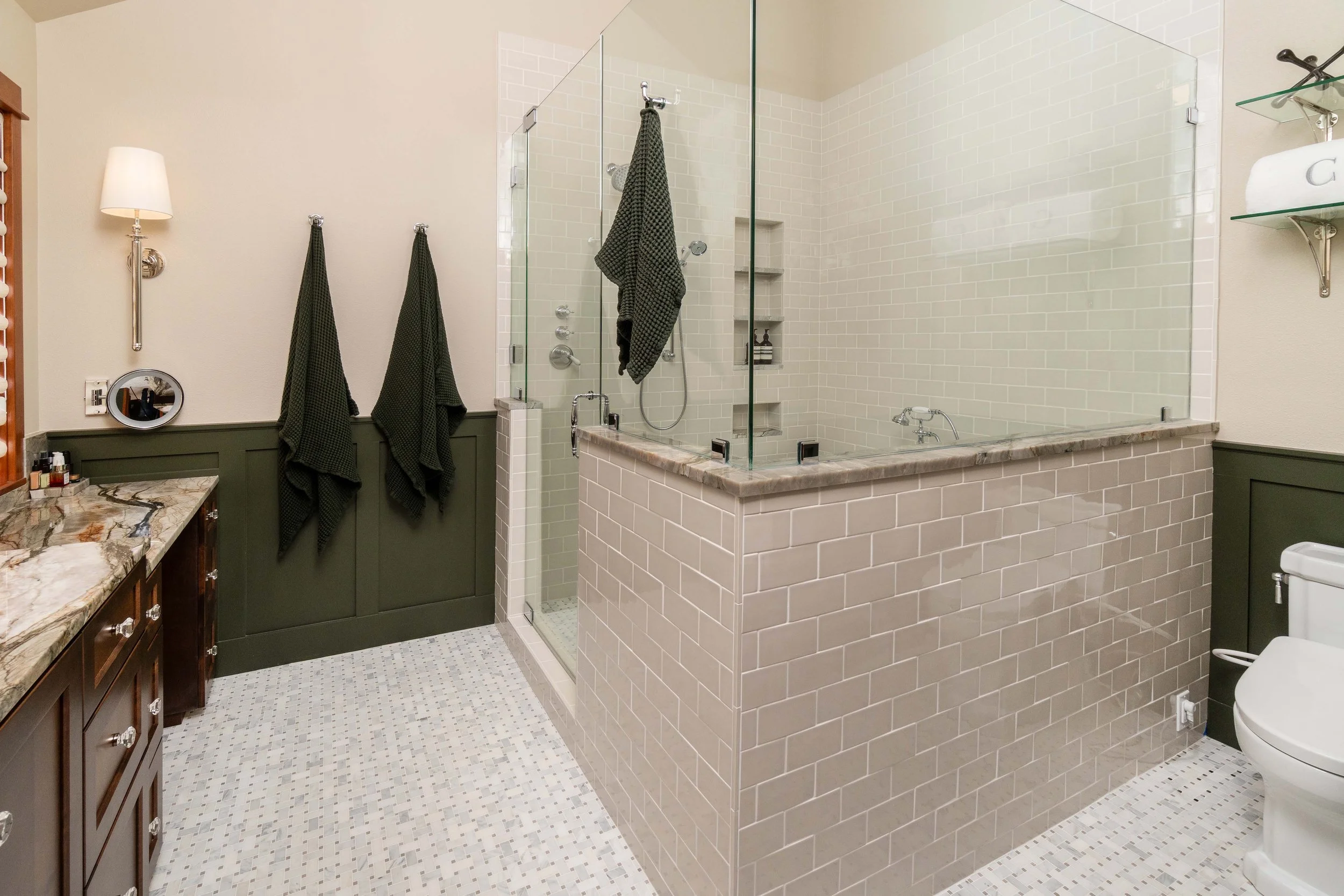 Nestled in the Bend foothills, this Craftsman primary suite remodel was designed to honor the home’s character while bringing a fresh, design-forward perspective to the space. The intention was to complement the existing Craftsman architecture with a palette rooted in the landscape—rich, earthy greens that ground the suite in warmth and authenticity.